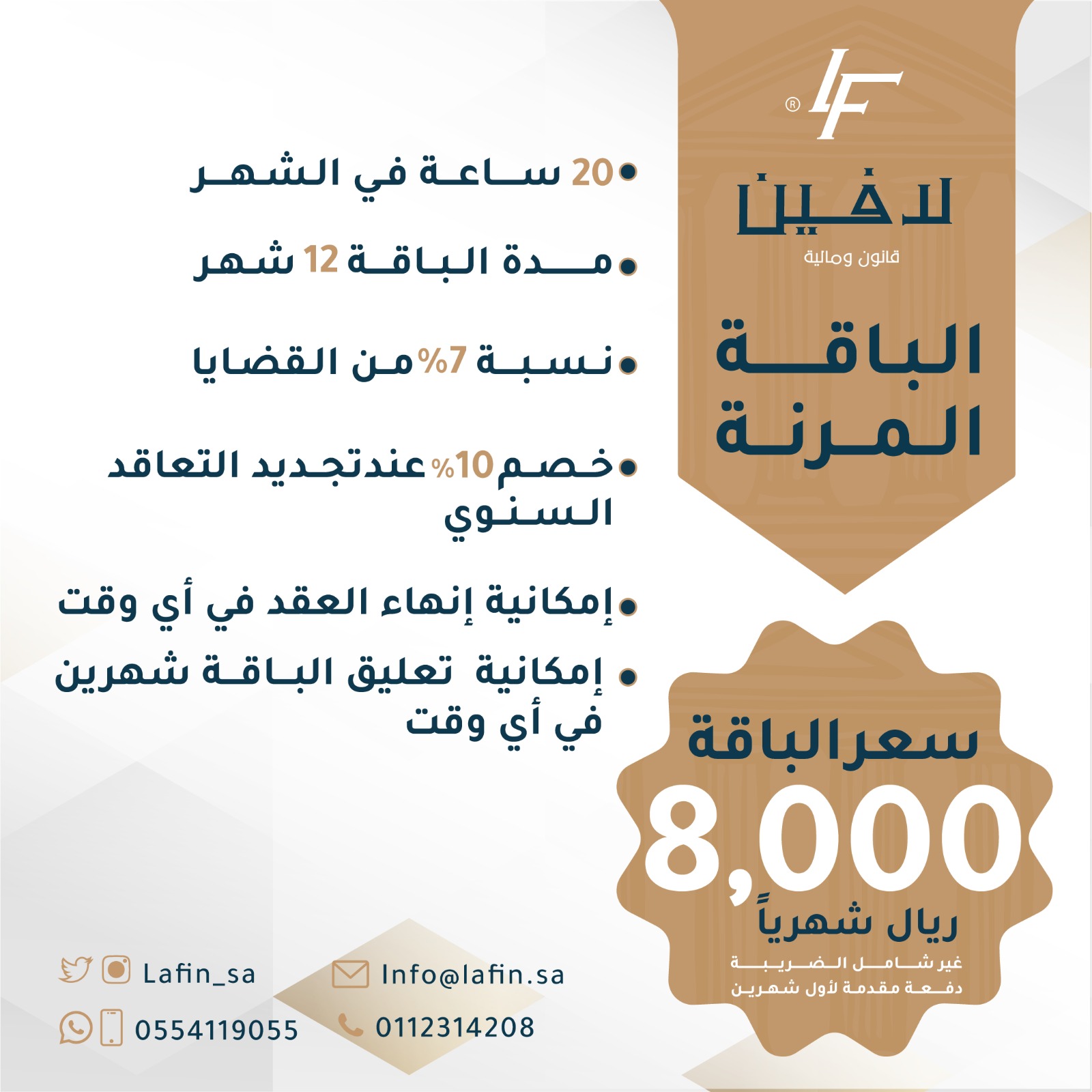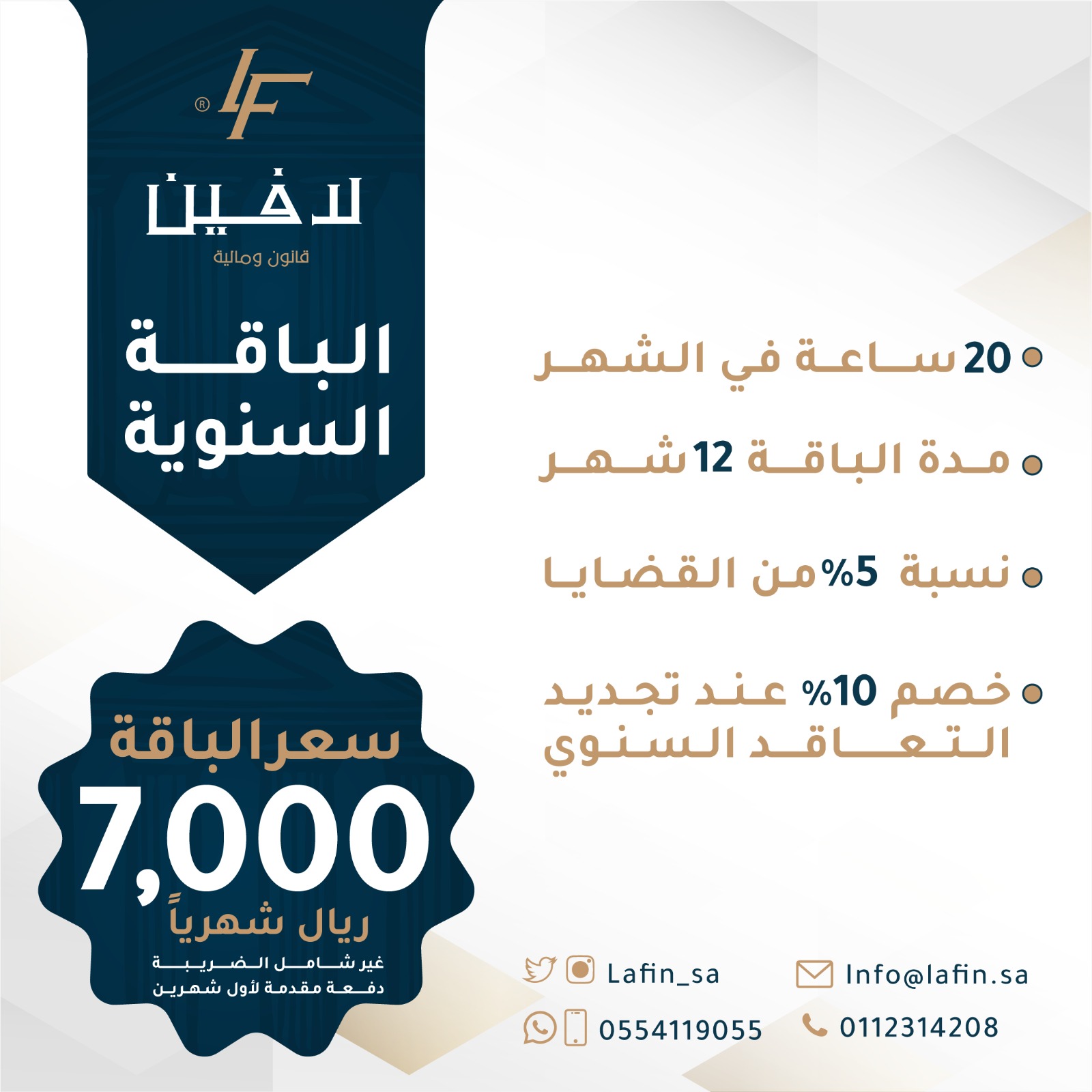 شركة تُقدم الخدمات المتكاملة المتعمّقة في مجالات القوانين المالية والتجارية بعلمية عالية وخبرة طويلة، نسعى للرقي والدعم للمجال القانوني وطنياً ودولياً بالتطوّر المستمر والاحترافية العالية، مع لافيين تتحقق أهدافك بأمثل الطرق والأساليب القانونية.